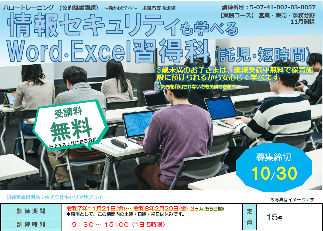 情報セキュリティも学べるWord・Excel習得科(託児・短時間) 定員は15名 受講生募集中 締め切りは10/30です