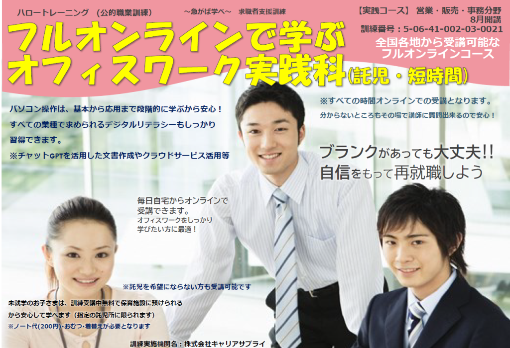 いよいよ8月開講!!フルオンラインで学ぶオフィスワーク実践科(託児・短時間) 全国各地から受講可能なフルオンラインのコースです。 募集期間は、令和6年6月17日…