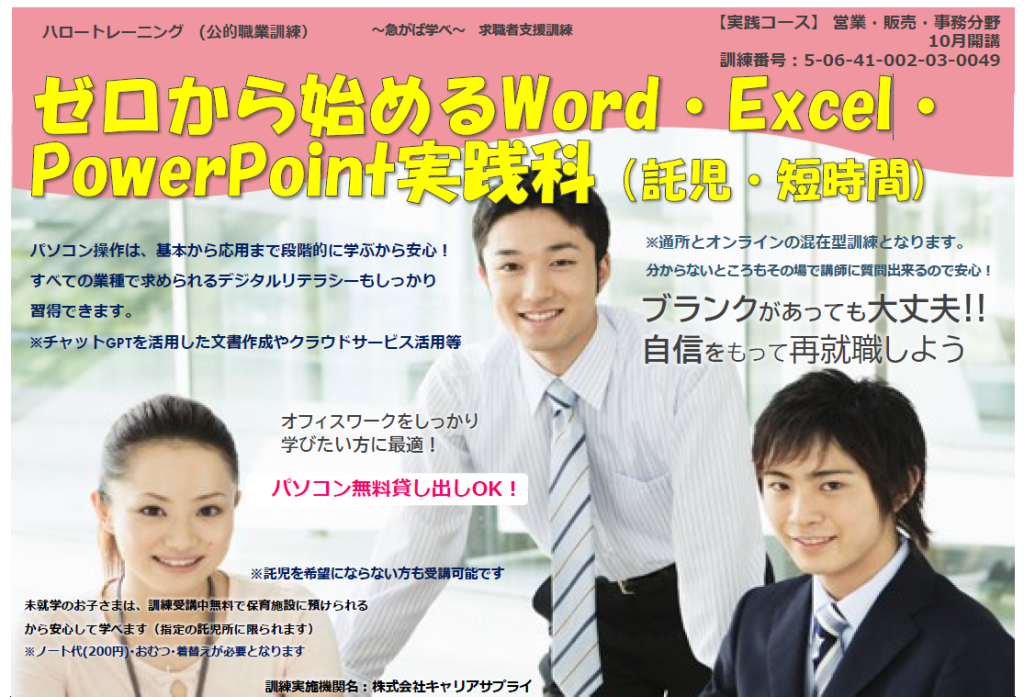 R6.10月開講 ゼロから始めるWord・Excel・PowerPoint実践科 通所コース 受講生募集!
