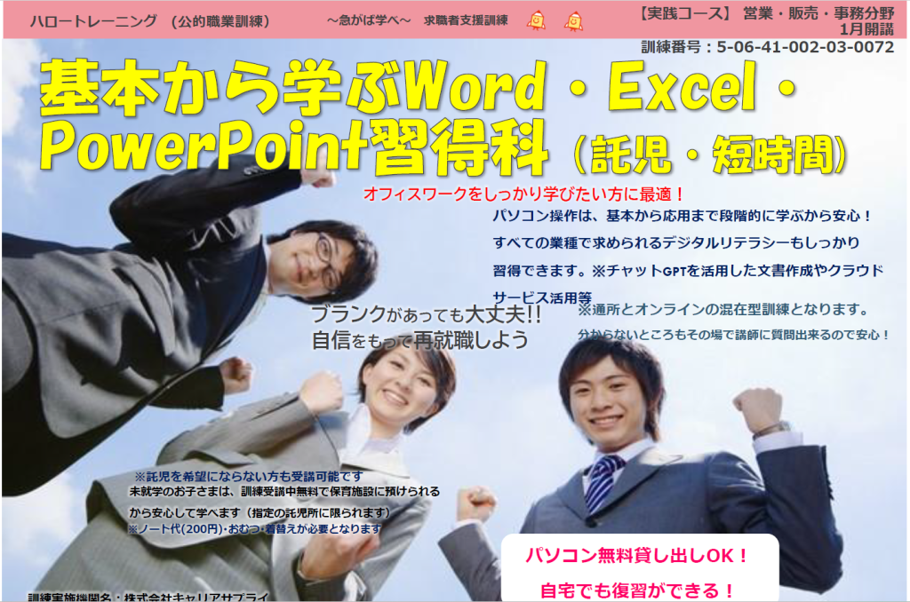 令和7年3月開講通所コース「はじめてのWord・Excel・PowerPoint習得科」受講生募集!