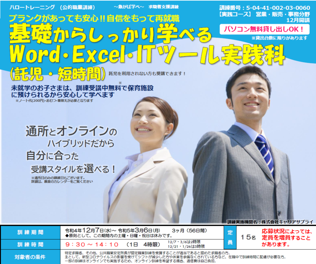 11月開講 教室への通所と自宅でのオンライン、どちらか選べるハイブリッド型職業訓練の募集を開始します! 訓練期間 2022年11月10日(木)から2023年2月…