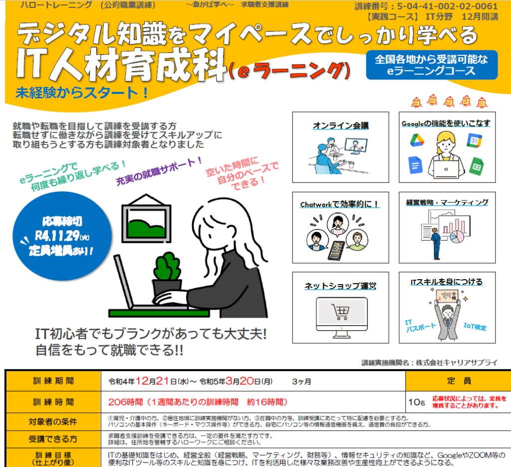 12月21日 eラーニング デジタル知識をマイペースでしっかり学べるIT人材育成科 訓練を開始しました!